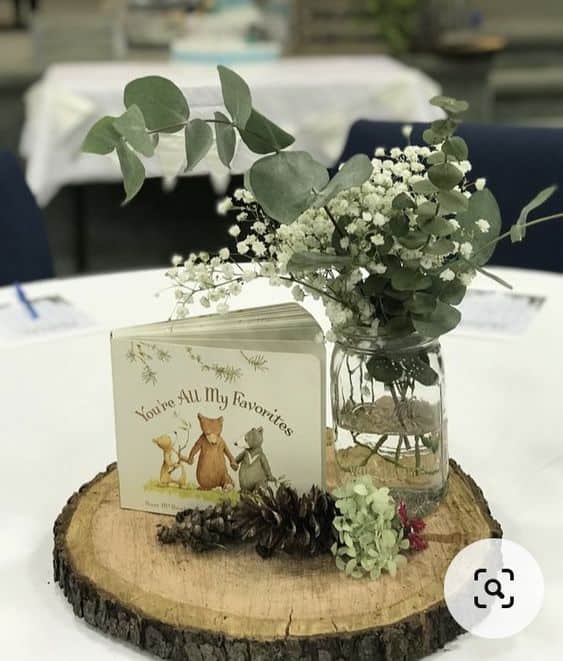 This thoughtful centerpiece features a classic children’s book propped up next to a clear glass jar of baby’s breath. Everything is anchored on a dark-edged wood slice, accented with a single pinecone and a sprig of dried hydrangea.