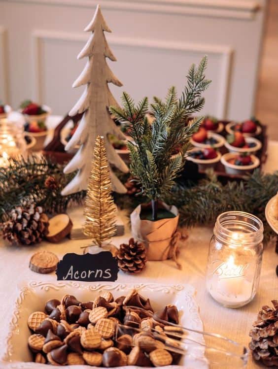 The snowy effect on the trees brings a touch of winter magic to the earthy theme. Using a darker green tablecloth provides a sophisticated base that makes the wooden elements really pop.