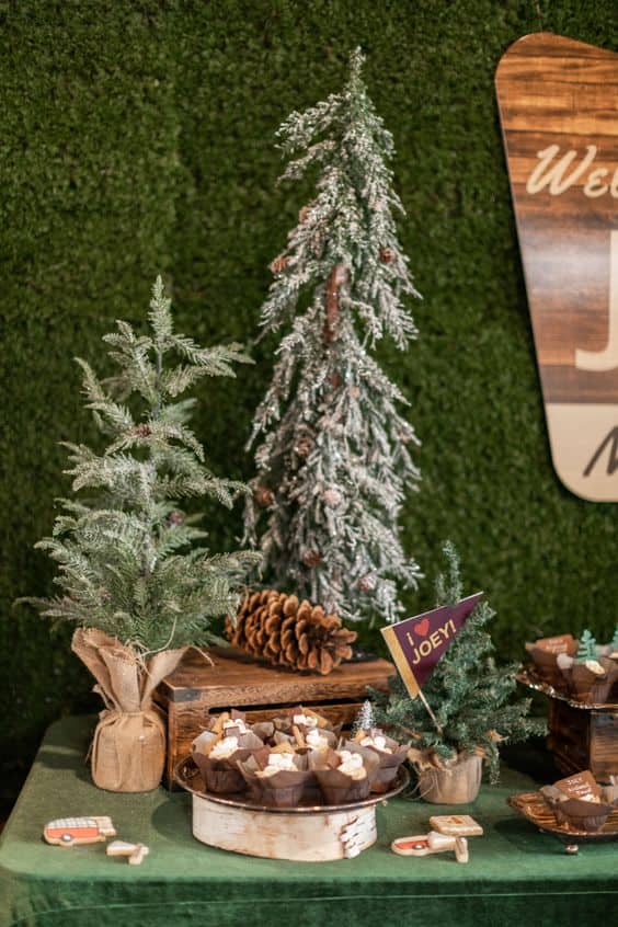 This dessert table is covered in a deep moss-green velvet cloth and features cupcakes topped with “Joey” flags and tiny pine trees. A large, flocked evergreen tree stands tall in the center, flanked by rustic wooden boxes and scattered pinecones.