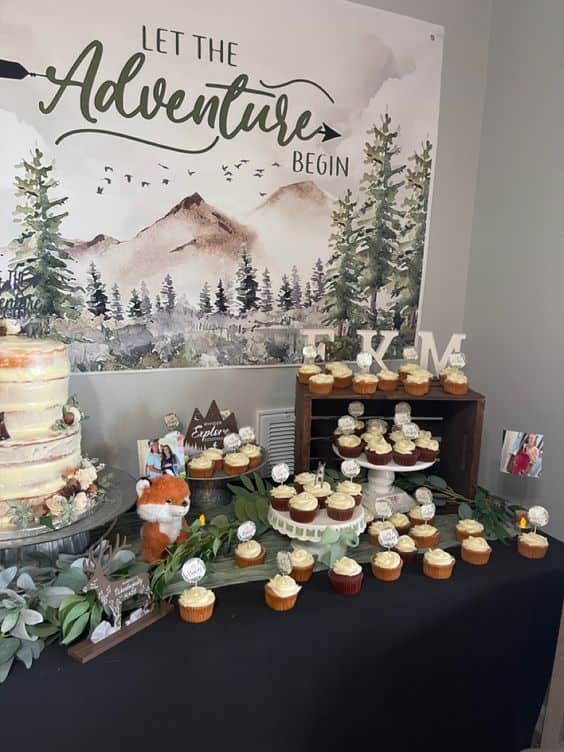 Cupcakes with custom “Let the Adventure Begin” toppers are spread across a black tablecloth featuring a backdrop of misty mountains. A tiered white cake sits on a galvanized metal stand, adorned with sprigs of greenery and tiny pinecones.