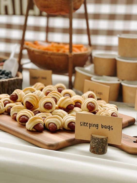 Miniature sausages wrapped in pastry are cleverly labeled as “sleeping bags” using a simple kraft paper card held by a small wood stump. They are served on a clean wooden paddle board next to rustic brown paper cups.