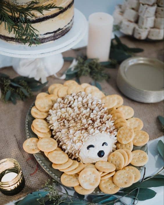 A whimsical cheese ball is shaped like a hedgehog, with almond slivers for quills and olives for eyes and a nose. It is surrounded by a ring of golden crackers and set on a table with burlap and eucalyptus accents.