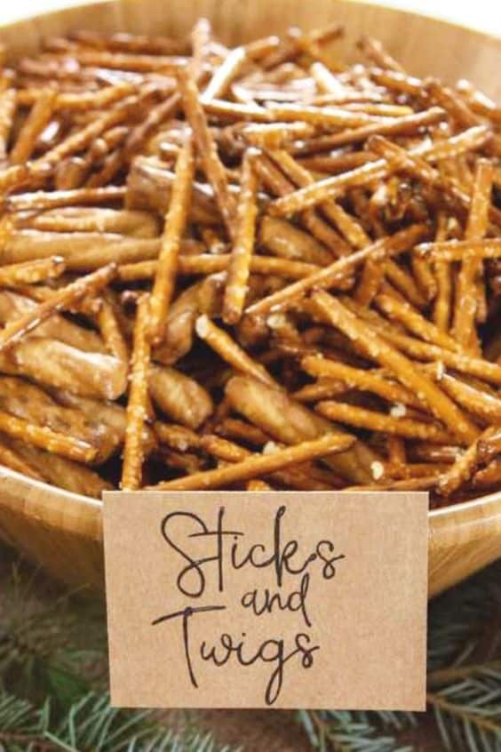 A large wooden bowl is overflowing with thin pretzel sticks, labeled simply as “Sticks and Twigs” on a kraft paper sign. The bowl sits on a bed of fresh evergreen branches.