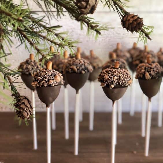 Chocolate-dipped cake pops are decorated with crushed nuts to look like acorns, complete with a tiny pretzel stick for a stem. They are displayed hanging under evergreen branches with small pinecones.