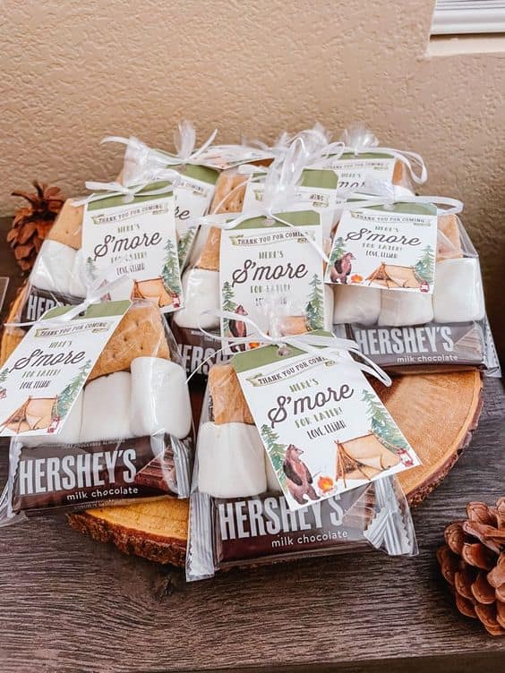 These favors are both practical and perfectly aligned with the “glamping” or outdoor theme. Sending guests home with a treat ensures the warm feelings of the party last a little longer.