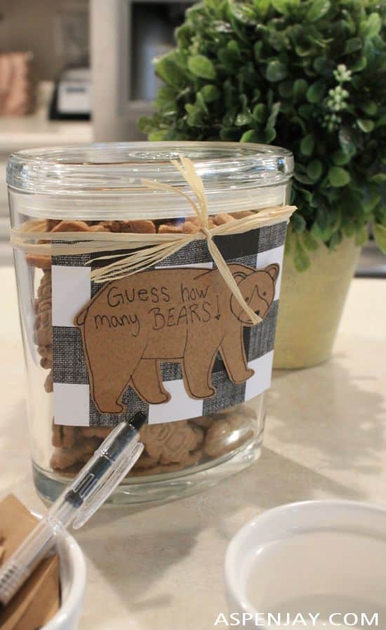 A glass jar is filled with chocolate teddy bear crackers, and guests are invited to guess the total number. The jar is decorated with a buffalo plaid ribbon and a brown paper bear cutout.