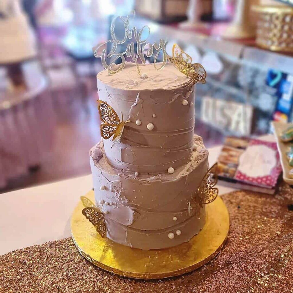 A tall, textured lavender-grey cake is adorned with delicate gold butterfly cutouts and tiny white pearls. It sits on a gold stand atop a shimmering rose-gold sequin runner.