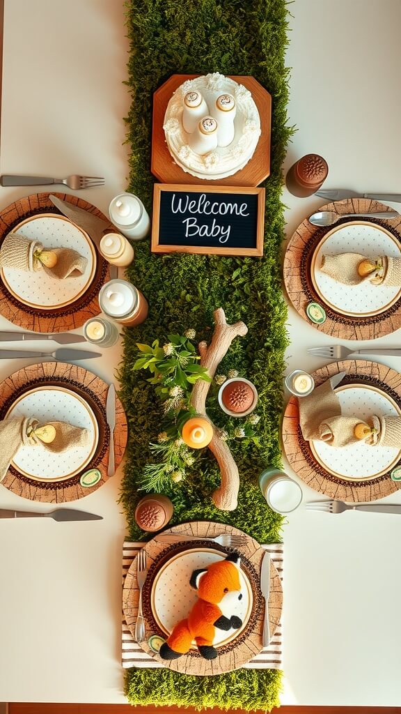 This beautiful tablescape brings the feeling of the forest floor directly onto the dining table, creating an enchanting gender neutral baby shower theme. A thick, lush moss runner runs down the center of the table, adorned with a small white cake, natural wood and twig accents, and an adorable stuffed fox resting on a place setting. Individual place settings feature wood-look chargers and burlap napkin rings.