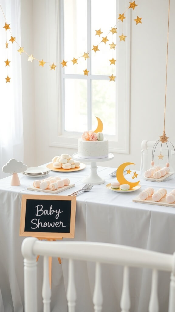This celestial theme is absolutely darling and a great choice for a peaceful gender neutral baby shower. Against a bright window backdrop, a simple white table is set with a cake topped with a golden crescent moon and flowers, surrounded by plates of pastel-colored macarons and marshmallows. A delicate golden star garland hangs in the window, completing the nighttime sky theme.