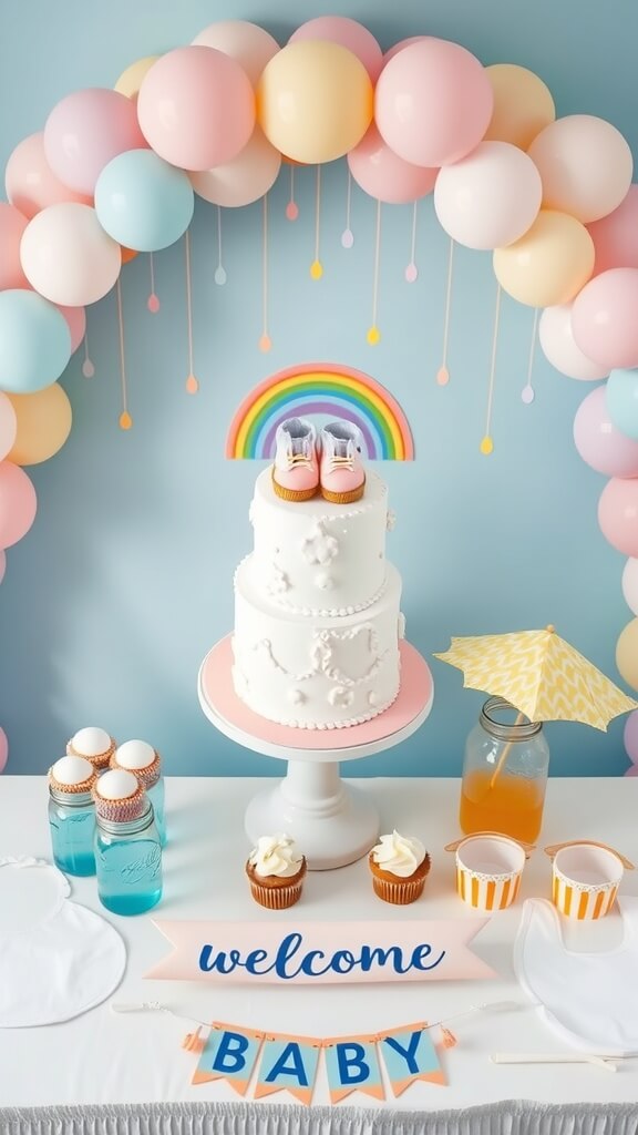 This colorful and cheerful setup embraces a sweet pastel palette under a delightful balloon arch, making it a perfect gender neutral baby shower celebration. The centerpiece is a white two-tiered cake topped with a vibrant rainbow and tiny baby shoes. The balloon arch features soft pink, yellow, blue, and peach colors, adding a whimsical frame to the entire scene.