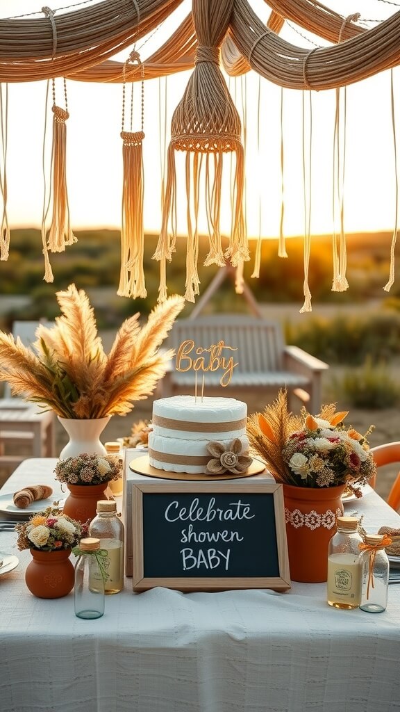 This stunning outdoor setup uses natural fibers and warm light to create a perfectly chic and organic gender neutral baby shower. The table is set beneath an intricate macrame canopy, featuring natural grasses like pampas and dried flowers in terracotta pots. A simple white cake with burlap ribbon and a “Oh Baby” topper anchors the scene, beautifully lit by the sunset glow.