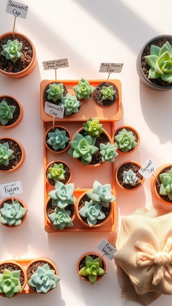 This display of tiny, vibrant succulents is a fresh, modern, and practical idea for a gender neutral baby shower favor table. The plants are arranged neatly in small terracotta pots and a peach-colored tray, with little handwritten plant stakes marking the varieties. A simple, cloth-wrapped gift sits beside the display, tied with a natural-fiber bow.
