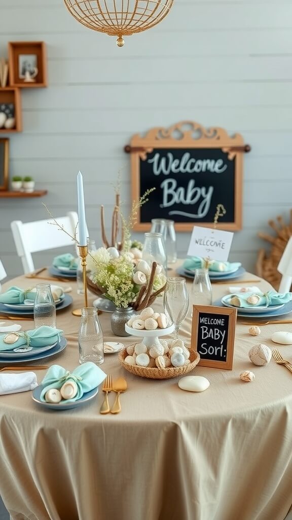 For a gender neutral baby shower that feels elegant and elevated, this Nordic-inspired tablescape is stunning. The round table is draped in a warm neutral cloth, set with light blue plates, gold cutlery, and napkins tied around little white candies. The centerpiece is a sparse, natural wood element with soft florals and tall candlesticks, anchored by a wooden chalkboard sign.