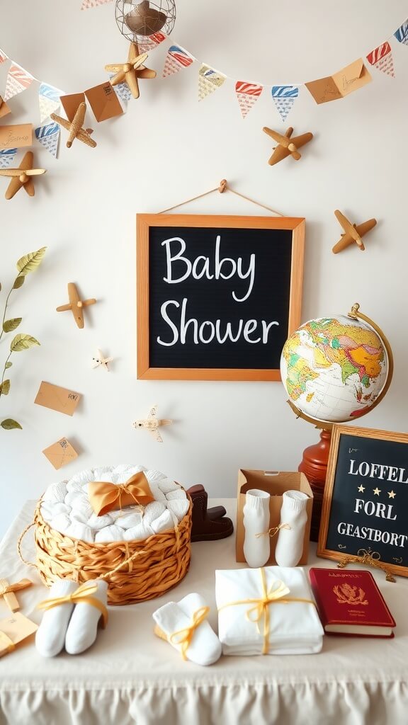 The visual composition beautifully layers travel motifs and baby necessities, creating a heartwarming and charmingly vintage-inspired look. The mood is adventurous, nostalgic, and filled with excitement for the journey ahead. To enhance this theme, incorporate vintage maps, tiny wooden airplanes, and old-fashioned postcards as part of the decor.