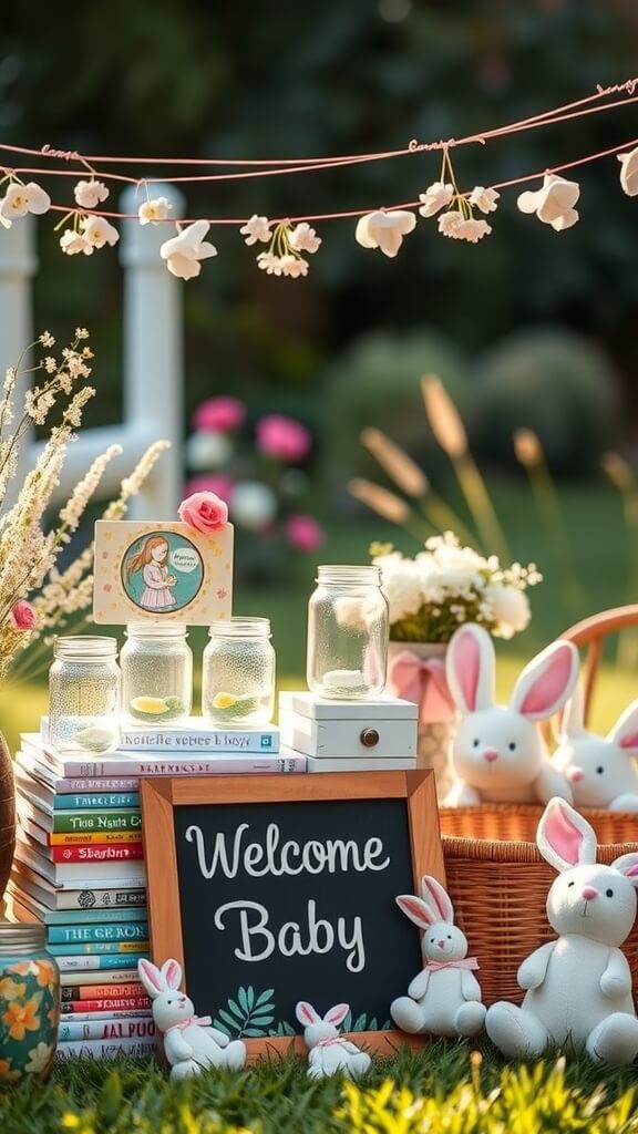 The visual success comes from the variety of textures—the hard spines of the books, the soft plush of the bunnies, and the woven basket—all in a charming garden setting. The mood is magical, innocent, and full of storytelling potential. Ask each guest to sign the cover of one of the books to create a cherished keepsake.