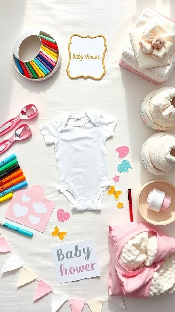 This activity-focused display is all about creative fun and personalized gifts, making it an excellent interactive gender neutral baby shower idea. A plain white onesie lies flat on a white surface, surrounded by colorful fabric markers, stencils, scissors, and a basket of pink and white cloth. The layout itself is bright, clean, and inviting.