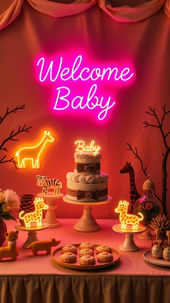 Hello, glowing fun! This vibrant setup takes a classic safari theme and gives it a cool, contemporary twist for a gender neutral baby shower. The backdrop is a rich pink-red, dramatically illuminated by a neon sign that says “Welcome Baby” and smaller neon cutouts of giraffes, adding a pop of unexpected color. The tiered cake is surrounded by playful animal figurines and a scattering of sweet treats on pedestals.