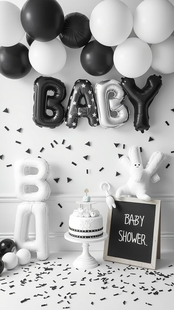 This striking monochromatic display is effortlessly chic and entirely appropriate for a modern gender neutral baby shower. The white wall is accented by a dramatic balloon garland featuring black, white, and metallic foil balloons spelling out “BABY,” scattered with confetti. A small white tiered cake on a pedestal is framed by a giant white stuffed rabbit and a large chalkboard sign.