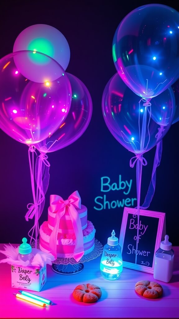 For a truly unique evening celebration, this neon glow theme is a fun, vibrant take on a gender neutral baby shower. Clear balloons are filled with colorful LED lights, casting a bright pink and blue glow over the table set with a pink-ribboned cake and glowing baby bottles. The dramatic lighting makes this theme feel electric and modern.