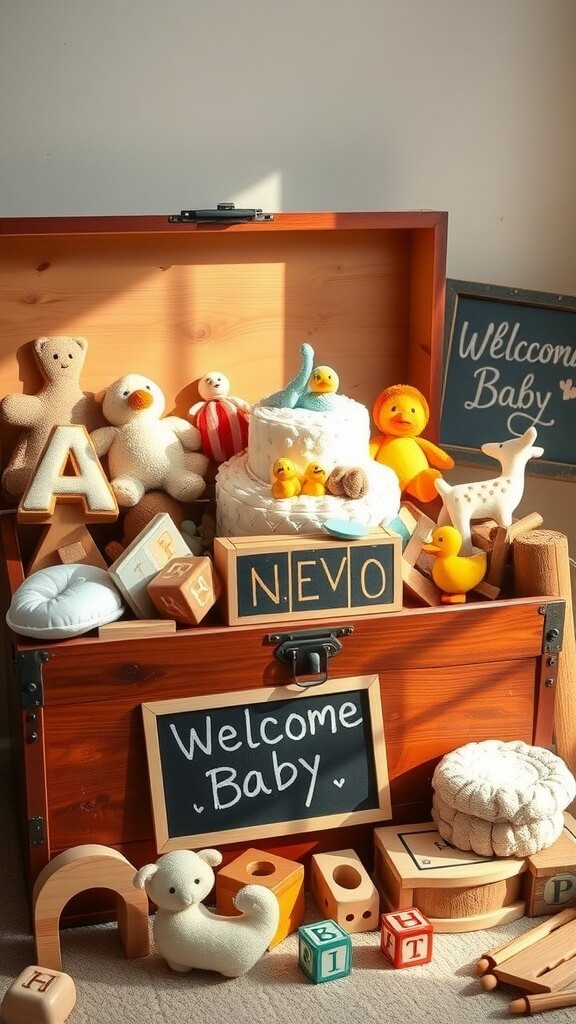 This nostalgic, timeless theme is centered around a charming, open wooden chest overflowing with classic toys, making it a lovely gender neutral baby shower setup. Soft animals, wooden blocks spelling out words, and little rubber duckies are piled artfully around a small white cake. Two chalkboards welcome the baby.