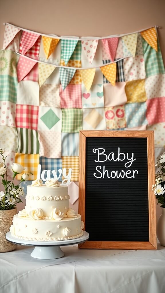 A lovely tribute to tradition and comfort, this patchwork backdrop is a uniquely homey choice for a gender neutral baby shower. The backdrop is a beautiful quilt made of mixed patterns—gingham, polka dots, stripes, and florals—in a soft, muted color palette. A simple two-tiered white cake with piped roses stands in front of a framed letter board sign.