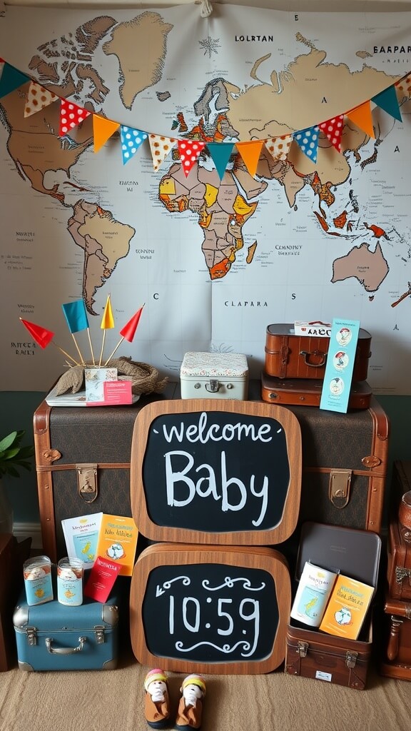 This delightful scene is perfect for parents who love travel, using a giant antique world map as a backdrop for a clever gender neutral baby shower. The foreground features stacked vintage suitcases, small chalkboard signs, and adorable baby shoes that look like little travelers. Colorful bunting hangs across the map, adding a festive touch.