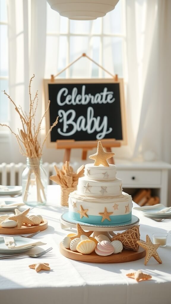 Bringing the calming essence of the seaside indoors, this light and airy theme is beautiful for a gender neutral baby shower. The window light floods the room, illuminating a tiered cake decorated with white icing, a blue band, and multiple gold starfish accents. Seashells and woven natural elements are scattered around the base and on the place settings, completing the coastal scene.