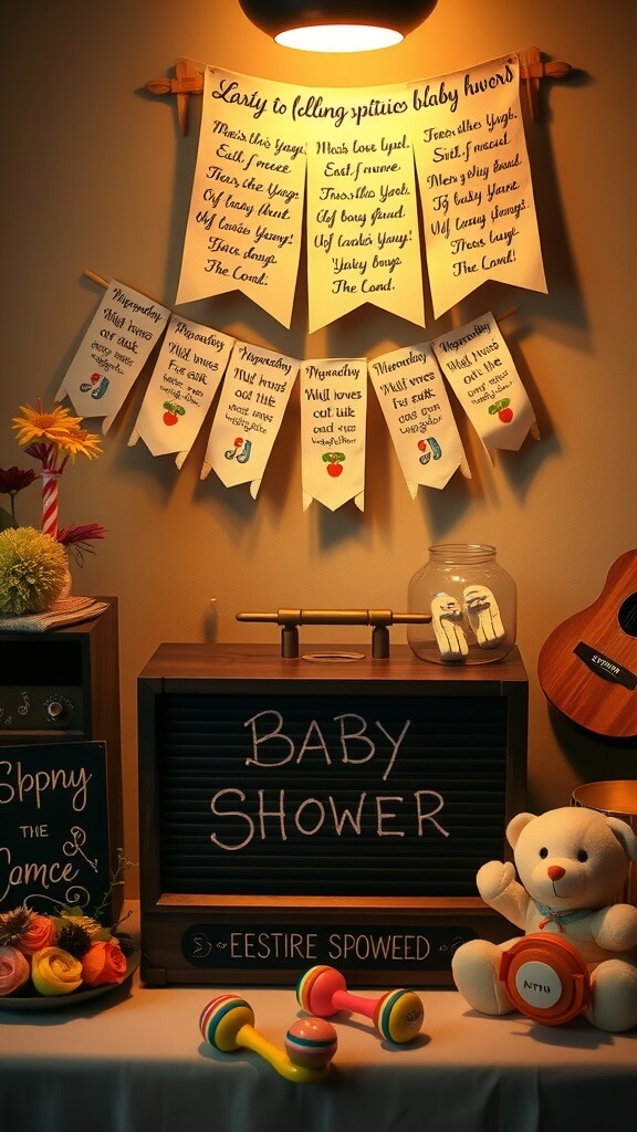 This unique theme centers around music, poetry, and storytelling, creating a lovely, heartfelt gender neutral baby shower celebration. The backdrop features scrolls of parchment or fabric printed with lyrical phrases, hung above a retro-style letter board that says “Baby Shower.” Maracas and a teddy bear complete the scene, hinting at music and play.