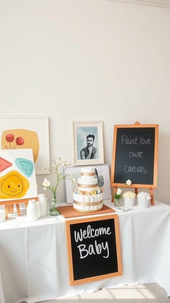 For the artistic parents, this creative studio setup provides a bright, modern, and fun gender neutral baby shower theme. The table features a white tiered cake flanked by two small easels—one displaying abstract, colorful art and the other a chalkboard sign inviting guests to “Paint Your Own Canvas.” Small white vases with fresh flowers and a framed portrait complete the clean, gallery-like display.