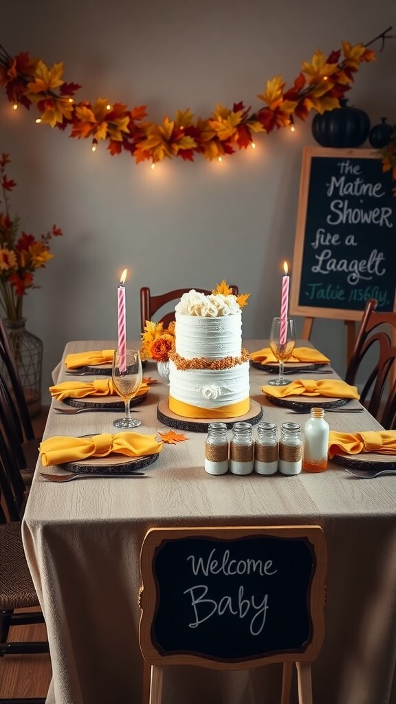 Perfect for a fall baby, this warm and inviting theme uses the colors of the season for a beautiful gender neutral baby shower. The dining table features a centerpiece of a white cake decorated with fall leaves, tall striped candles, and napkins in rich harvest gold. A garland of colorful maple leaves with lights is strung across the wall, casting a cozy glow.
