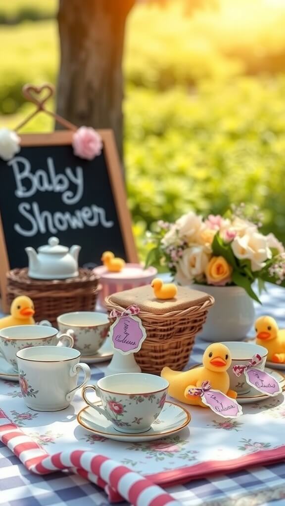 This bright and charming setup combines the elegance of a tea party with the playful innocence of a rubber ducky theme, ideal for a gender neutral baby shower. The outdoor table is set with vintage teacups, a small teapot, and a delightful scattering of bright yellow rubber duckies among a bouquet of pale pink and peach roses.