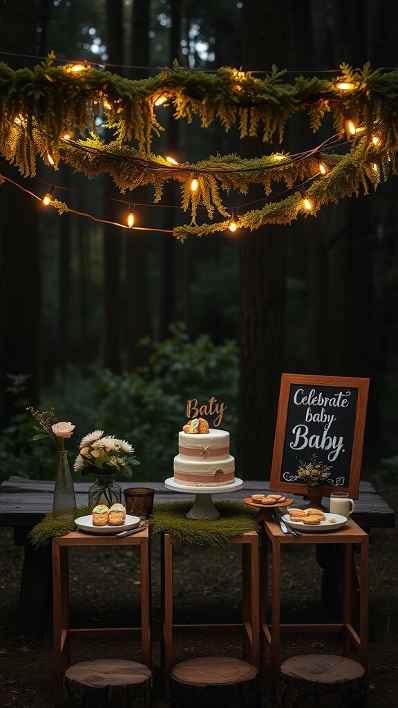 This gorgeous deep-woods setting, illuminated by hanging market lights draped with mossy garland, is a captivating idea for a gender neutral baby shower. The simple wooden table is set with a tiered cake, small bouquets of flowers, and appetizers, all framed by the dark, mysterious forest background. The use of tree stump seating and accent tables further enhances the theme.
