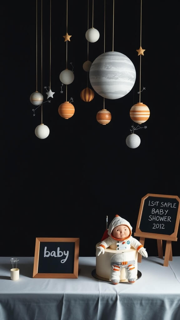 This out-of-this-world theme is a blast of originality and a stunning choice for a gender neutral baby shower. Hanging from above are celestial decorations, including models of planets in muted gray, white, and copper tones, set against a dramatic black backdrop. The cake features a tiny baby in an astronaut suit, a delightful and fun centerpiece, alongside two small chalkboards.