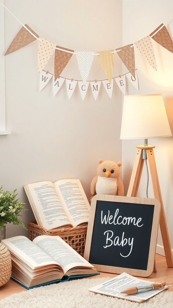 For the book-loving parents, this cozy library theme creates a quiet, intellectual, and intimate gender neutral baby shower. The corner setup features a patterned bunting banner, a floor lamp with a wooden base, and a low basket overflowing with open books. A stuffed owl sits next to a chalkboard sign that says, “Welcome Baby,” setting a literate, comfortable scene.