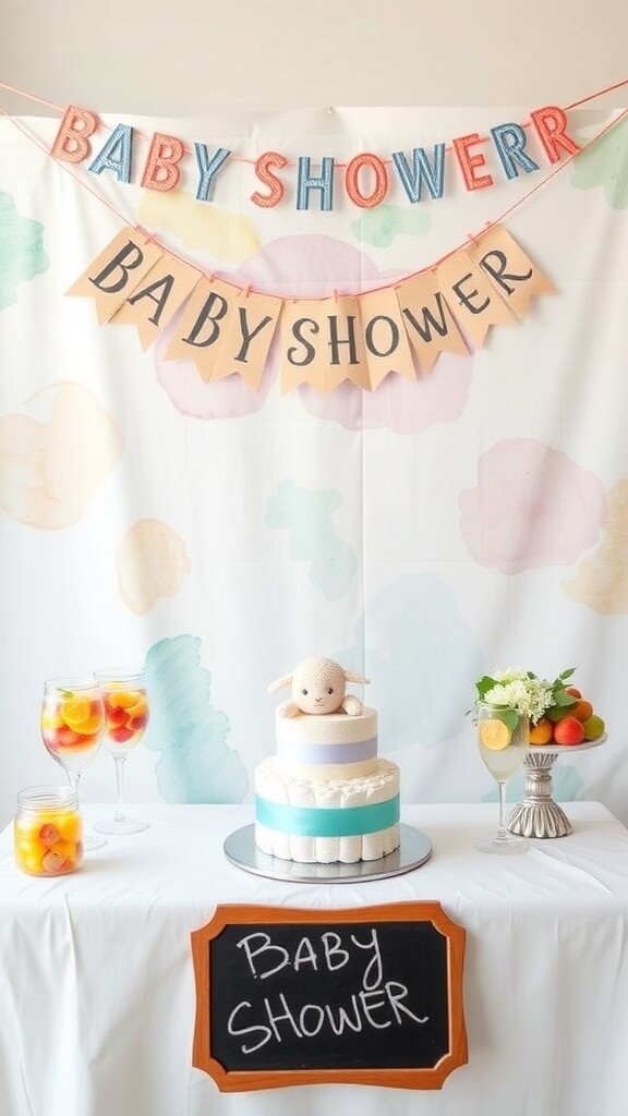 This soft, artsy scene features a backdrop of subtle, pastel watercolor washes, creating a calming and artistic setting for a gender neutral baby shower. A two-tiered diaper cake with a little stuffed lamb topper sits on the table, alongside a variety of colorful fruit cups and drinks. A classic chalkboard sign anchors the foreground.