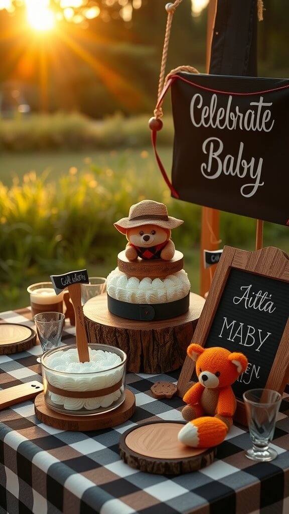 This sweet, gingham-check setting feels warm, casual, and perfect for an outdoorsy gender neutral baby shower. The scene is set with a buffalo plaid tablecloth and bathed in soft sunset light, highlighting a tiered cake topped with a charming teddy bear wearing a straw hat. Natural wood slices are used as cake stands and placemats, bringing a rustic touch to the display.