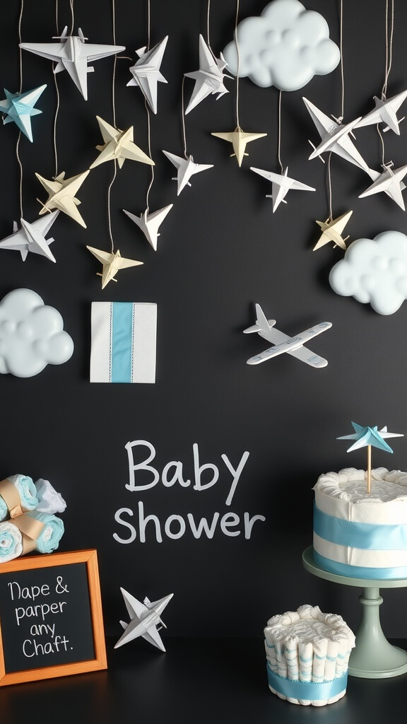This backdrop is utterly charming, featuring a whimsical sky scene with hanging paper airplanes and soft, cloud-shaped accents against a dark blackboard wall, making it a cute gender neutral baby shower theme. A simple white cake with blue ribbon sits on a pedestal, flanked by diaper cakes tied with ribbon and a chalkboard sign.