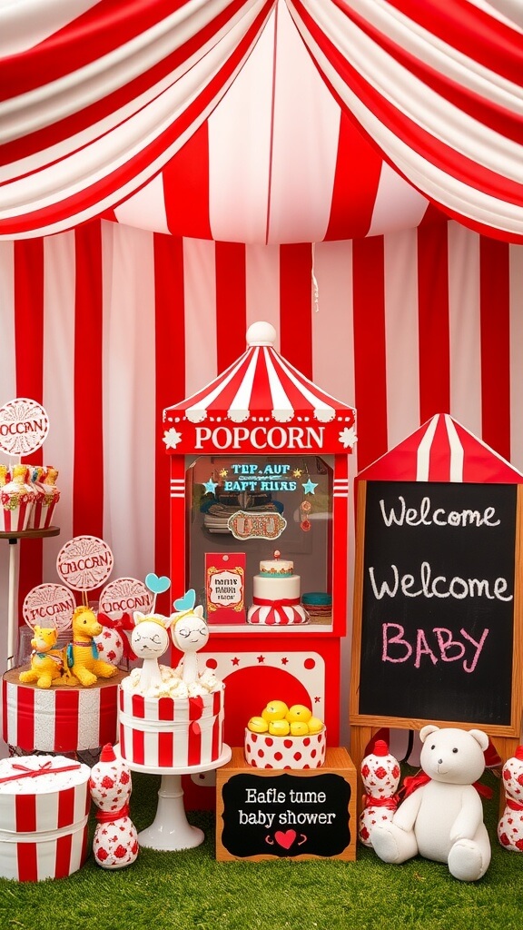 Here is a grand, high-energy take on the circus theme, focusing on bold red and white for a striking gender neutral baby shower. The scene is dominated by red and white striped fabric and a miniature popcorn cart display, flanked by chalkboards and stacked boxes. Two white-iced cakes are topped with whimsical animal figures, adding a fun, playful element.