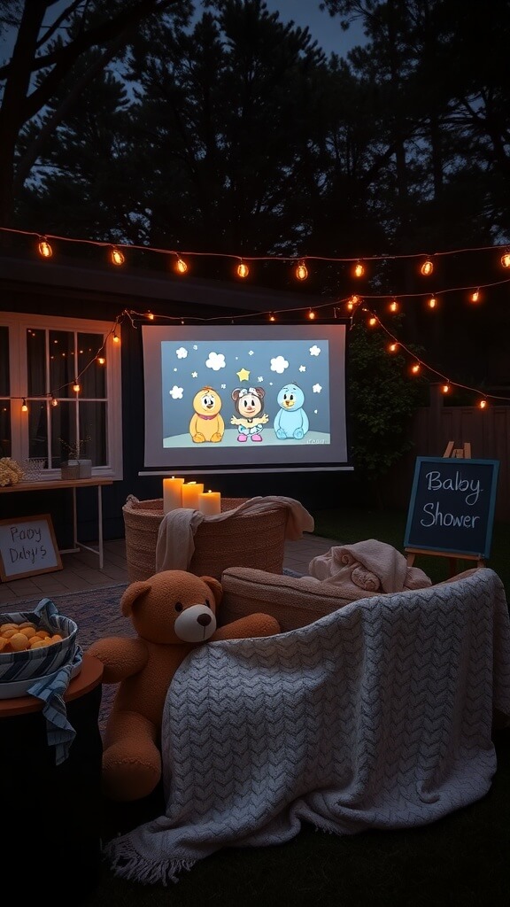 For a uniquely cozy and relaxed evening gender neutral baby shower, this outdoor movie night is a winner. String lights twinkle over a yard setup with a screen showing a cheerful cartoon, surrounded by plush blankets, throw pillows, and candles. A large teddy bear is nestled in a wicker basket, creating the ultimate snuggle spot.