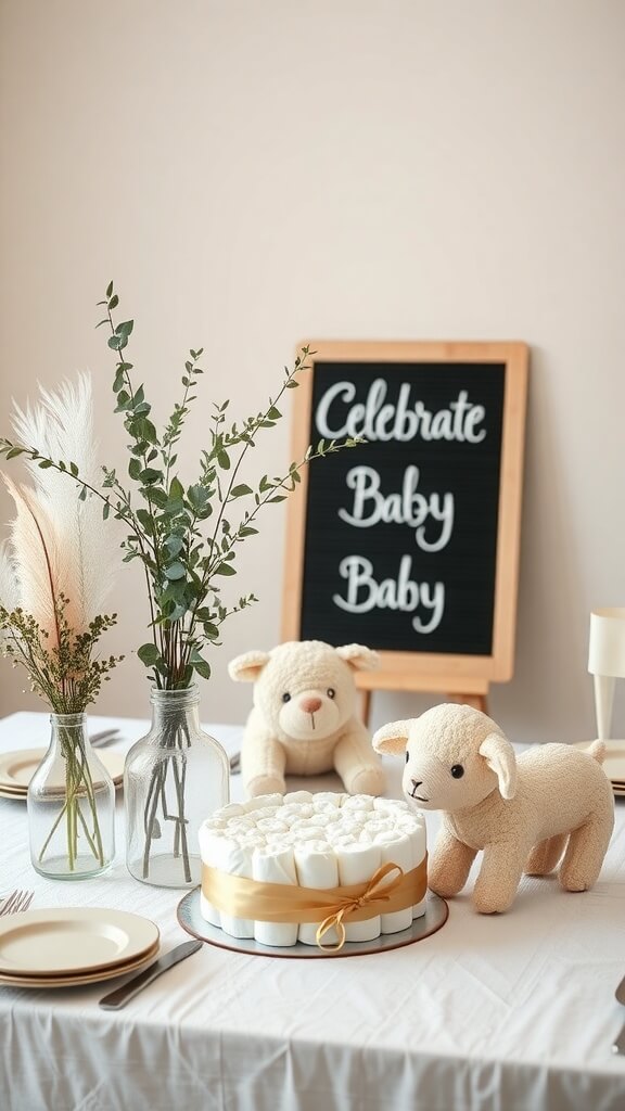 This sweet, natural setup focuses on soft textures and neutral tones, creating a cozy and gentle gender neutral baby shower environment. The display includes two fluffy, stuffed lamb toys guarding a simple white cake wrapped in marshmallows and tied with a gold ribbon. Vases of eucalyptus and feathery pampas grass add height and a touch of bohemian elegance.