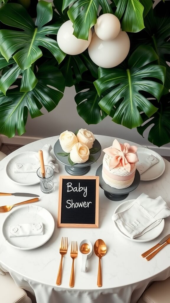 This setup brings a lush, modern, and vibrant feel to a gender neutral baby shower by using bold tropical greenery. Huge monstera leaves frame the tablescape, which features two small cakes—one with ruffled texture and a pink bow, the other with simple buttercream roses—on chic gray risers. The white marble table is set with modern gold cutlery and minimal place settings.