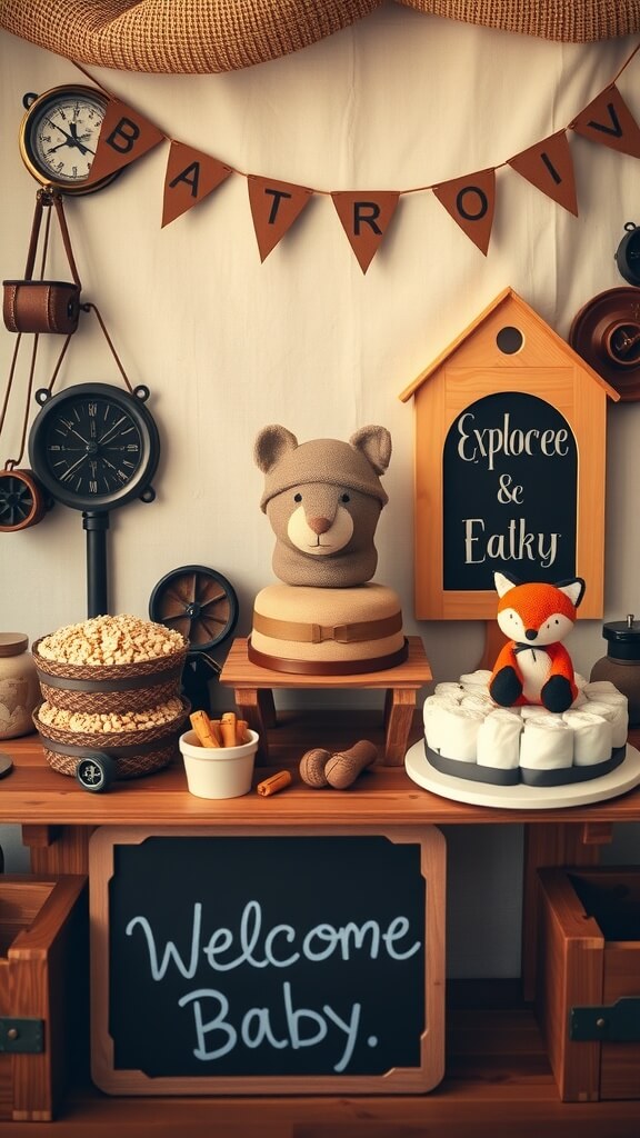This charming setup captures a whimsical, adventurous ‘Explore & Eat’ theme that is perfect for a truly original gender neutral baby shower. The rustic wooden table is adorned with vintage-inspired elements like old clocks, leather accents, and an adorable house-shaped chalkboard sign. The centerpiece is a tiered cake with a teddy bear head topper, flanked by woven baskets of snacks and a cute stuffed fox.