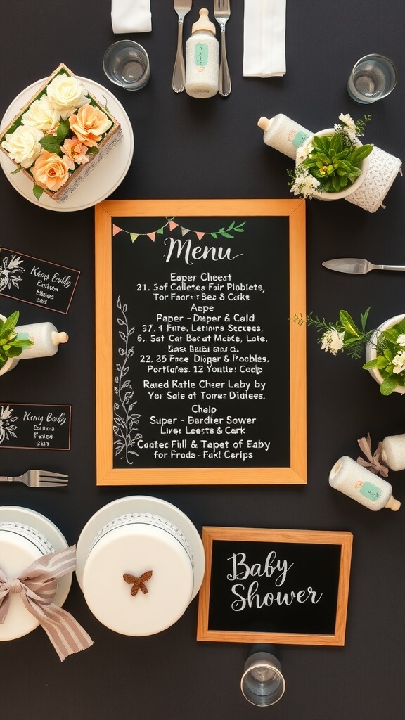 This sophisticated overhead shot showcases a dramatic tablescape, proving that a dark palette can be incredibly chic for a gender neutral baby shower. The black tablecloth is a stark background for the brightly framed menu chalkboard and individual place settings featuring white plates, light peach roses, and baby bottles as favors.