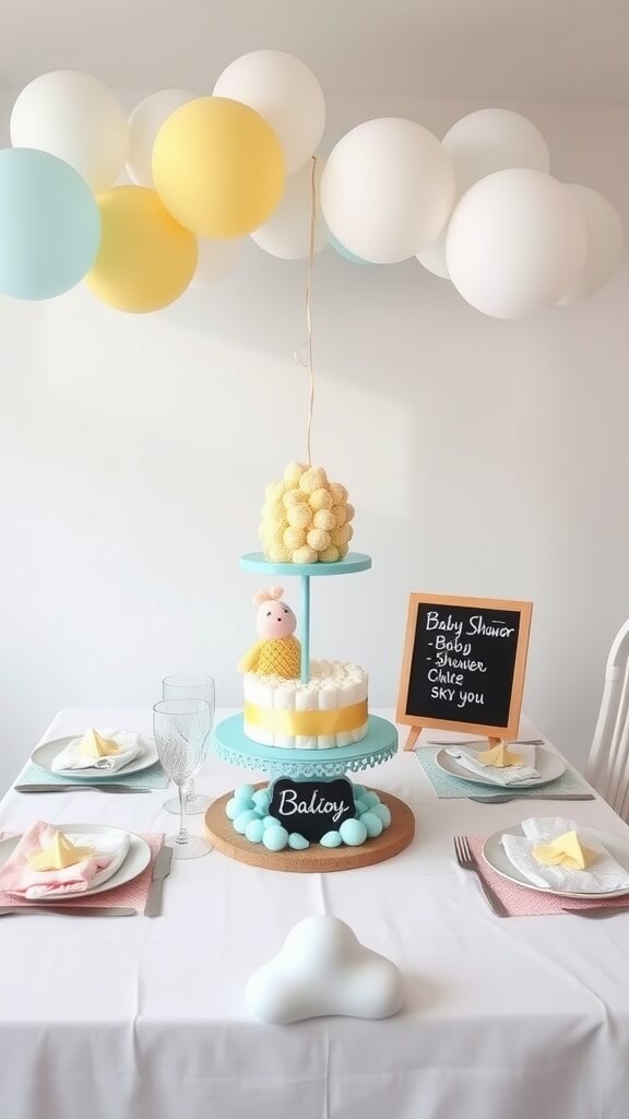 The design is effective because it uses soft pastel colors—yellow, light blue, and white—in equal measure, keeping the aesthetic balanced and sweetly whimsical. It feels airy, joyous, and perfectly innocent, like a sweet children’s illustration brought to life. Recreate the light, floating effect by using helium-filled balloons and securing the strings with delicate ribbons or weights.