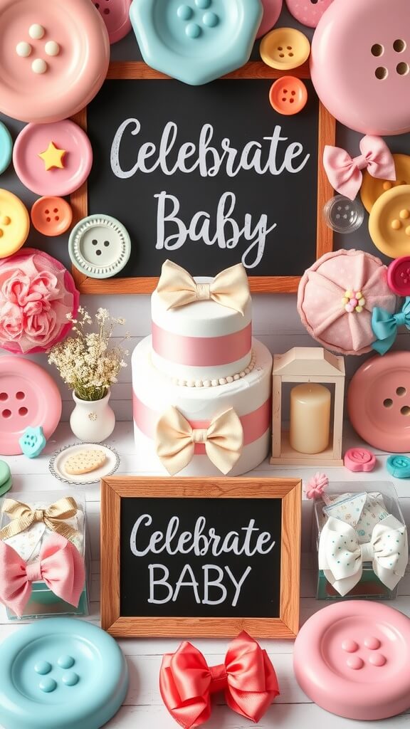 This visually playful and textural display uses giant and mini pastel buttons and bows as the main motif for a charming gender neutral baby shower. A white cake is adorned with pink ribbons and large cream bows, surrounded by decorative buttons in soft pink, blue, yellow, and mint, creating a delightful crafts-inspired scene.