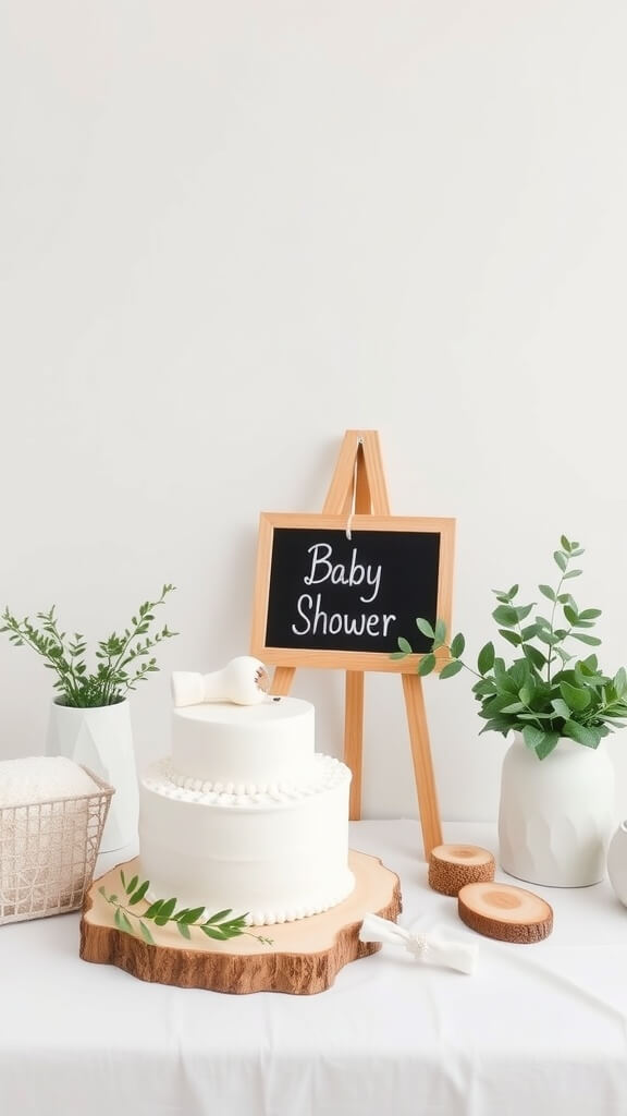 This setup proves that sometimes, less really is more, embracing a clean and organic aesthetic ideal for a gender neutral baby shower. A pristine white cake topped with a tiny white bow sits on a thick, natural wood slice, immediately drawing the eye to the earthy, modern centerpiece. Fresh green sprigs of eucalyptus and other simple plants in white ceramic vases bring life and vibrancy to the crisp white backdrop, offering a delightful contrast of texture and color.