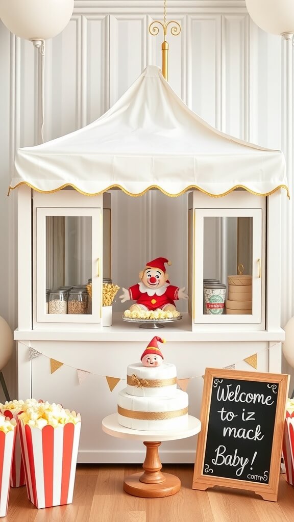 Talk about a showstopper! This playful setup brings the nostalgic fun of a chic carnival to a gender neutral baby shower. The focal point is a miniature white and gold tent display cabinet, filled with popcorn and featuring a small clown doll on a pedestal, all set against a white and gold backdrop. The tiered cake echoes the theme with gold ribbons and another tiny clown topper, standing next to a chalkboard sign that welcomes the baby.