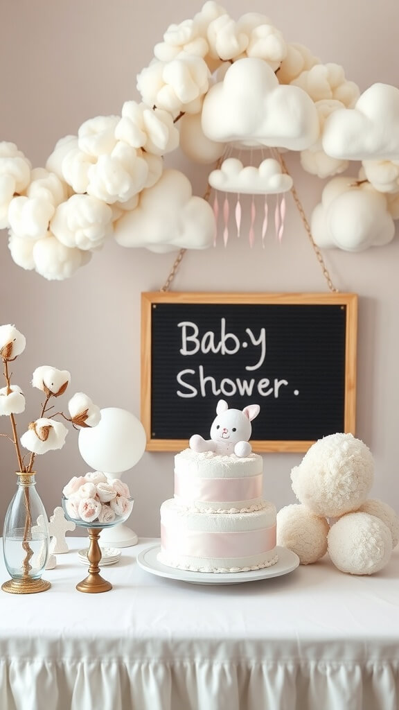 This image captures the ultimate in soft, dreamy ambiance, perfect for a cozy gender neutral baby shower. The backdrop features fluffy white decorations shaped like clouds and hanging puffs that almost look like cotton balls, creating a light, airy sky scape. A two-tiered cake with delicate pink ribbons and a sweet stuffed bunny topper anchors the table, surrounded by vases of cotton flowers and soft, round white textures that mimic clouds.