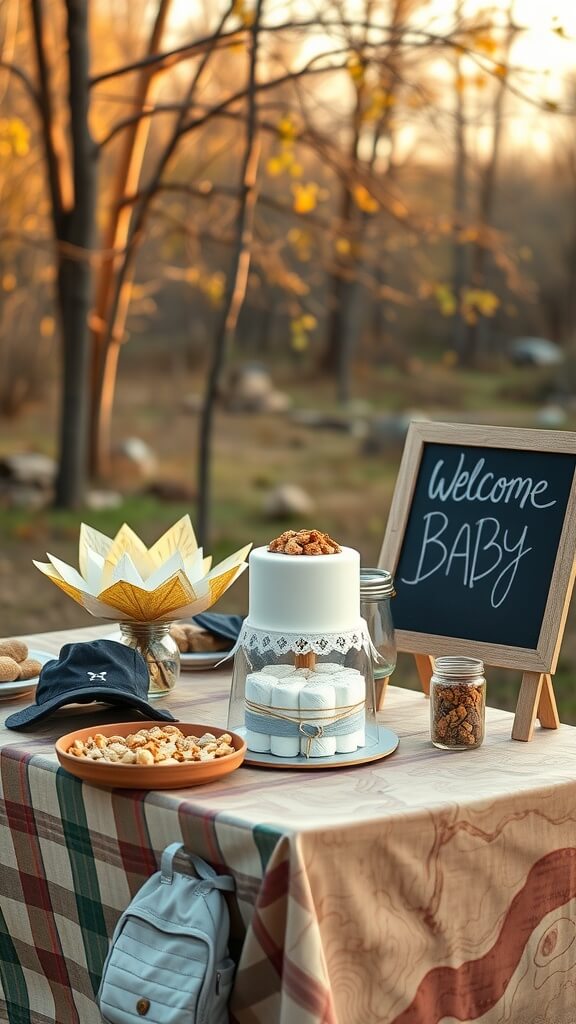 Set outdoors against the backdrop of a forest at sunset, this rustic display is perfect for a gender neutral baby shower focused on comfort and nature. A diaper cake wrapped in a blue ribbon and marshmallows serves as the centerpiece, surrounded by nuts and trail mix in bowls and jars. A plaid tablecloth and a small backpack complete the cozy, natural aesthetic.