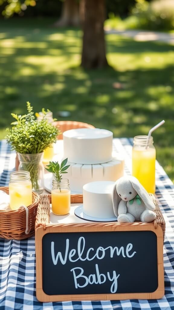 Embracing the charm of a sun-drenched day, this picnic table setting is perfect for a relaxed, outdoorsy gender neutral baby shower. A black and white gingham tablecloth is covered with woven baskets, simple white cakes of varying sizes, and a little stuffed bunny with a green ribbon. Jars of sunny yellow juice complete the cheerful scene.